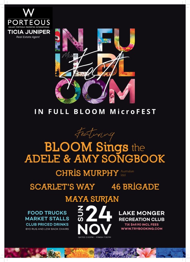 Sunday, November 24th – Lake Monger Recreation Club – 2.00pm – 7.30pmGet ready for a magical afternoon of music, food, and fun at the In Full Bloom Micro Fest! 🌿 Set in the serene outdoor setting of the Lake Monger Recreation Club, this is your chance to experience a perfect blend of soulful tunes and a cozy atmosphere right in the heart of Perth’s inner suburbs.🎤 Featured Artist: “BLOOM” 🎤